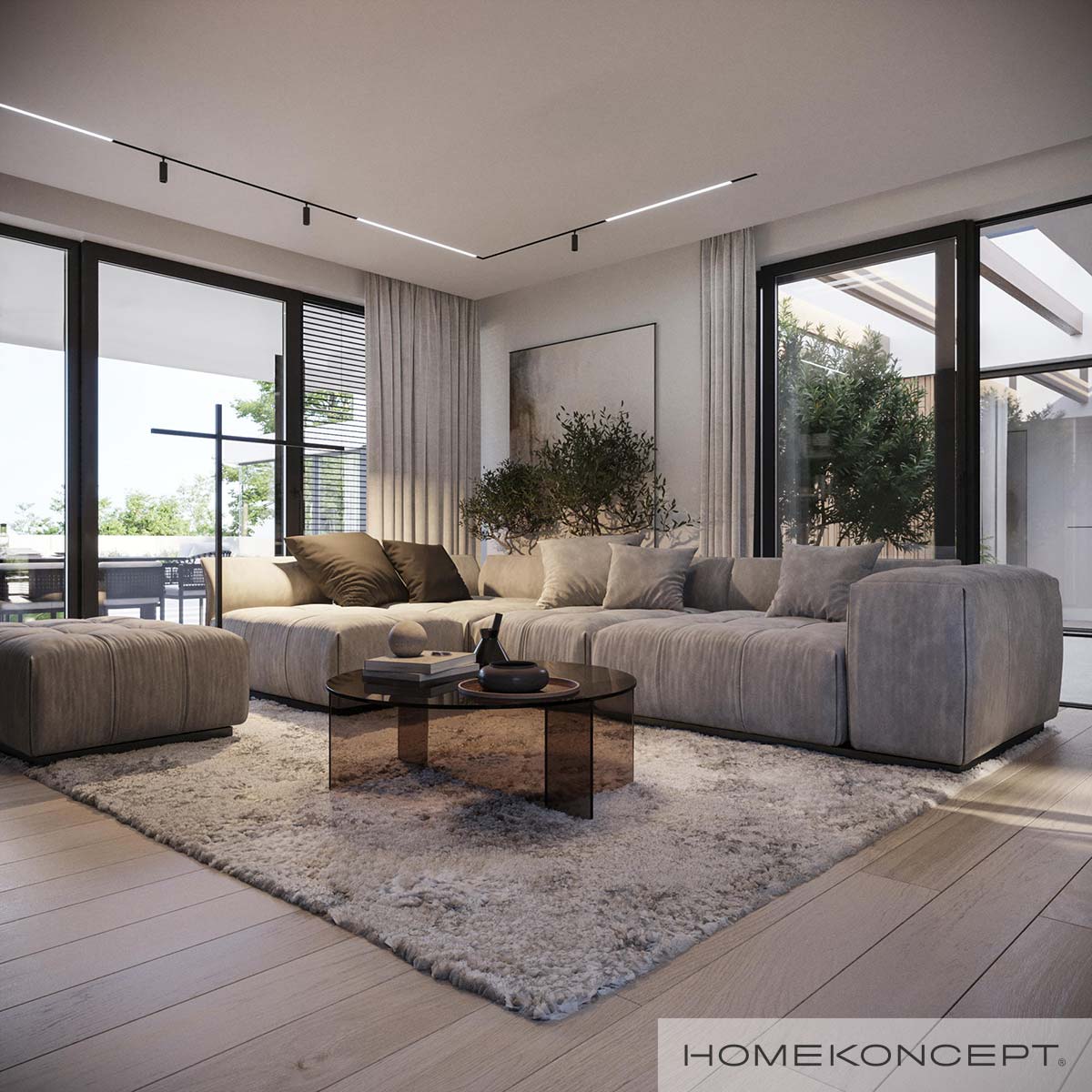 HOMEKONCEPT 110 to atrakcyjna propozycja domu parterowego z płaskim dachem, ciesząca się popularnością wśród naszych klientów. Ten oryginalny dom z garażem dwustanowiskowym oczarowuje funkcjonalnym, pięknym wnętrzem i śmiałą wizją stylistyki bryły.