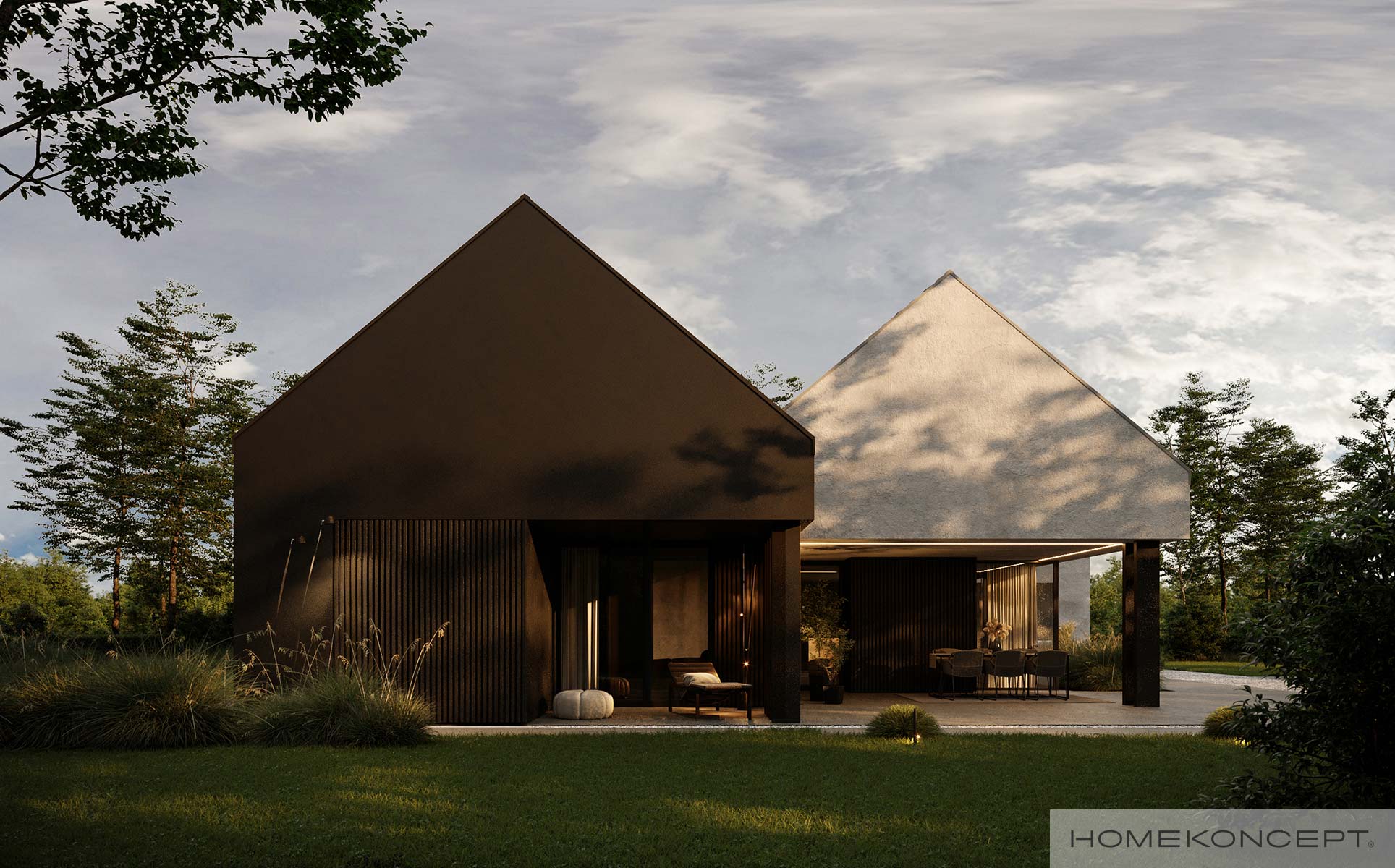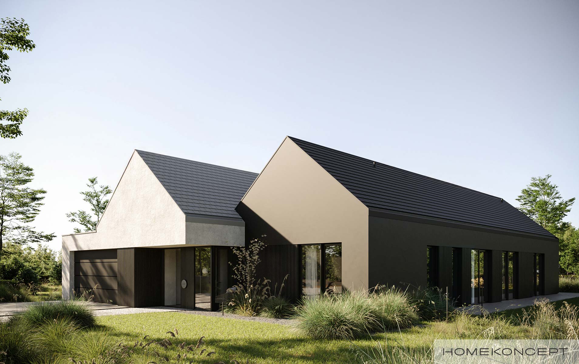 Kształt budynku przypomina dwie bryły w stylu eleganckiej nowoczesnej stodoły połączone ze sobą, gdzie garaż jest lekko wysuniętym przed lico budynku. Dzięki różnej kolorystyce ich elewacji, celowo stworzono kontrast tak by efekt przenikania ich przez siebie był jeszcze bardziej widoczny. Typowym zabiegiem w projektach stworzonych przez naszych architektów jest użycie licznych przeszkleń, szczególnie w okolicy strefy dziennej, czego również nie mogło zabraknąć w naszym najnowszym projekcie. Fantastycznie doświetlają wnętrza, nadając propozycji jednocześnie designu na najwyższym poziomie jak i wielu cech energooszczędności.