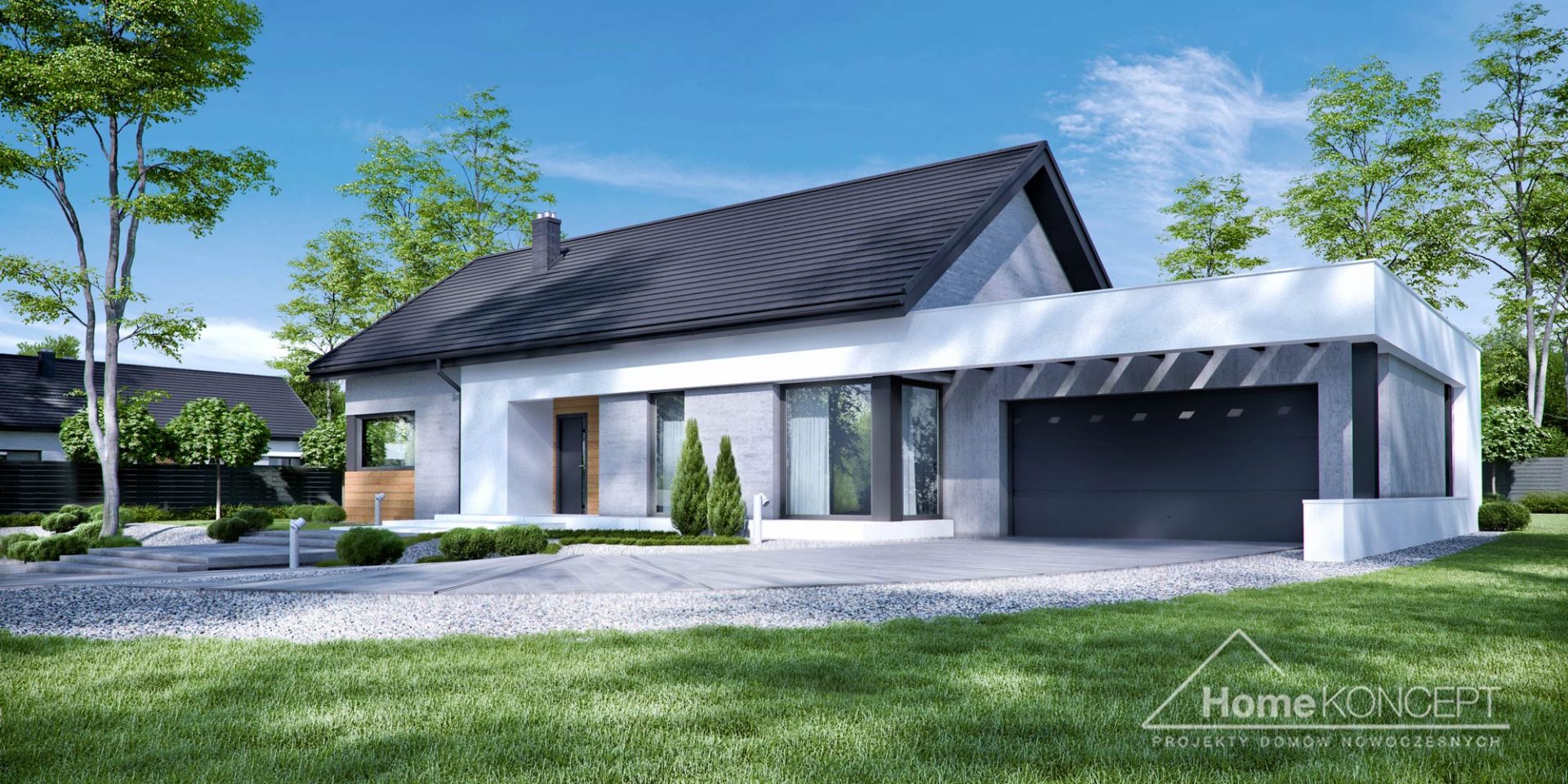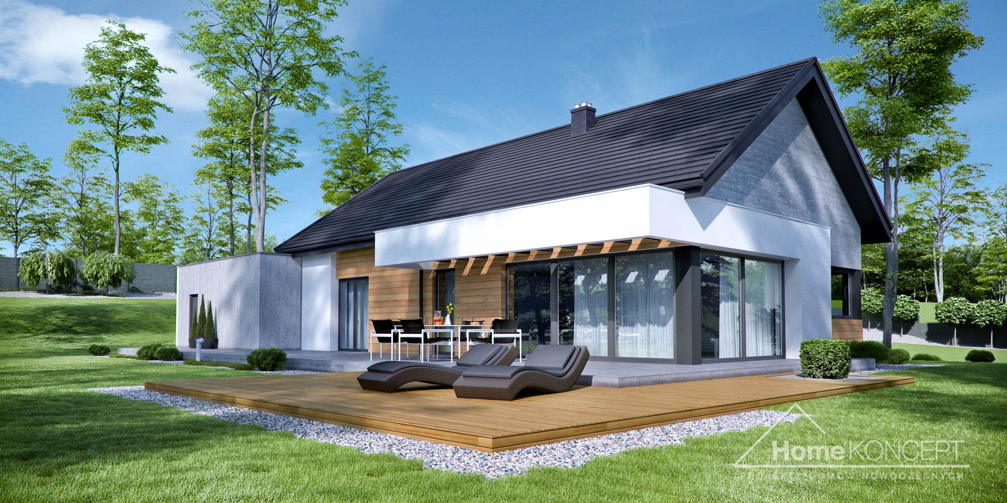 HomeKONCEPT 45 G2 to nowoczesny parterowy dom. Przyciąga uwagę piękną bryłą i bardzo elegancką aranżacją elewacji. Budynek został zaprojektowany na planie wydłużonego prostokąta, dzięki czemu doskonale nadaje się do realizacji na wąskich działkach. Dom posiada, bardzo ekonomiczny w budowie, dwuspadowy dach pokryty płaską dachówką. Pokrycie dachu idealnie harmonizuje się z elewacją, zaprojektowaną z szarych betonowych elementów z domieszką naturalnego drewna. Opaska ozdobna znajdująca się dookoła budynku – to znak rozpoznawczy projektów HomeKONCEPT. Belkowanie od strony ogrodu przekształca się w ażurową pergolę, która stanowi ciekawy element ozdobny tego projektu. Duże przeszklenia zastosowane zamiast tradycyjnych okien, zapewniają wnętrzom mnóstwo światła, przy okazji powiększając optycznie wszystkie pomieszczenia.