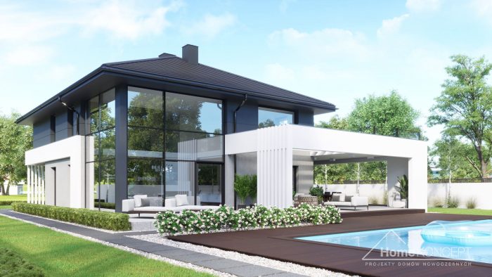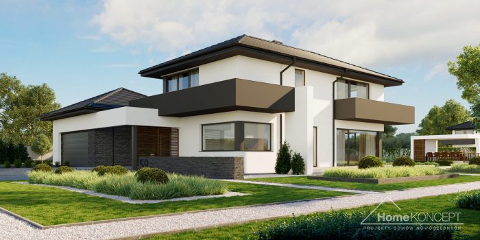 HomeKONCEPT 74 wyróżnia niezwykła bryła, którą okala unikatowe belkowanie, nadające całości niezwykłego szyku oraz elegancji. Doskonale skomponowana elewacja utrzymana w kolorystyce bieli i bieli wraz z ciemną stolarką okienna podkreślają modernistyczny charakter budynku.