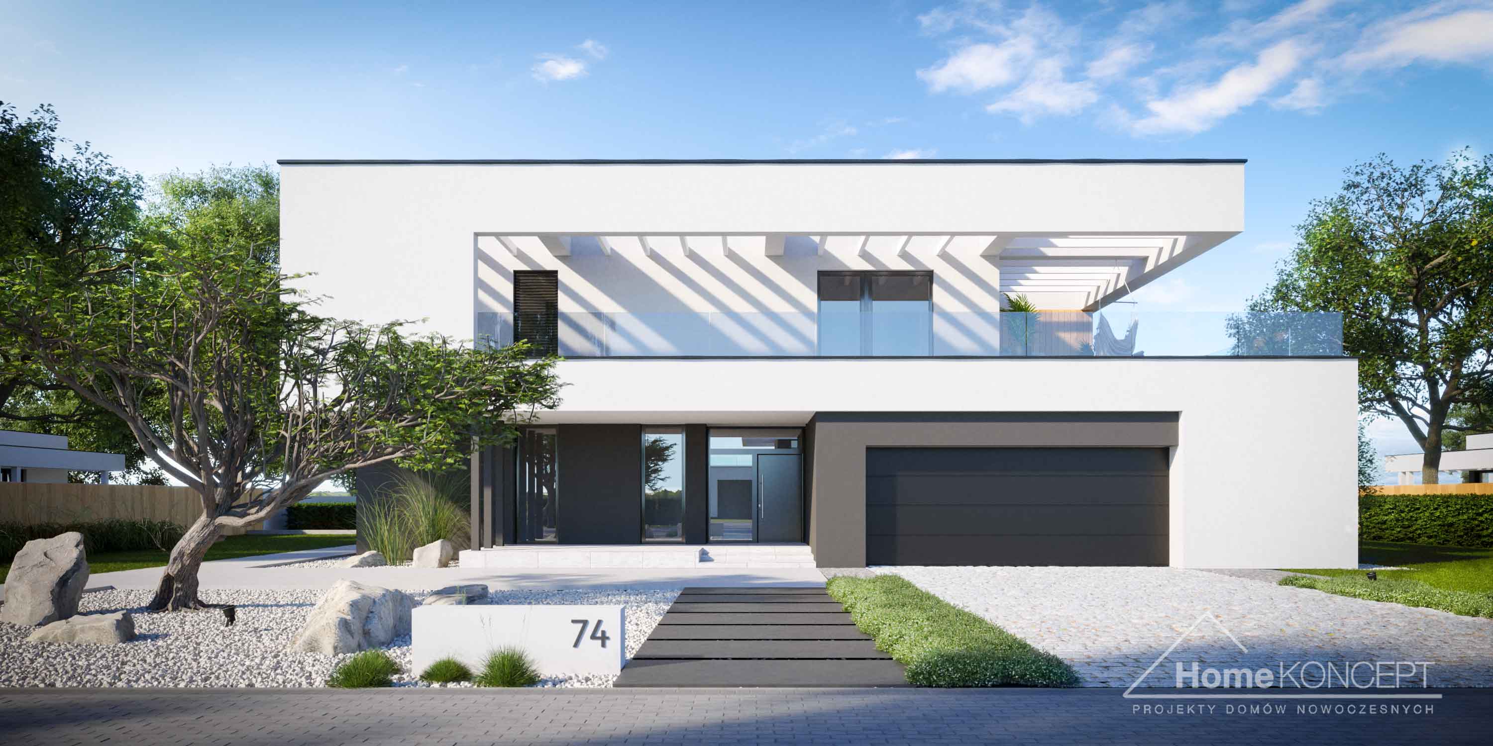 HomeKONCEPT 74 to Projekt Nowoczesnej Willi z Garażem dwustanowiskowym oraz płaskim dachem.
