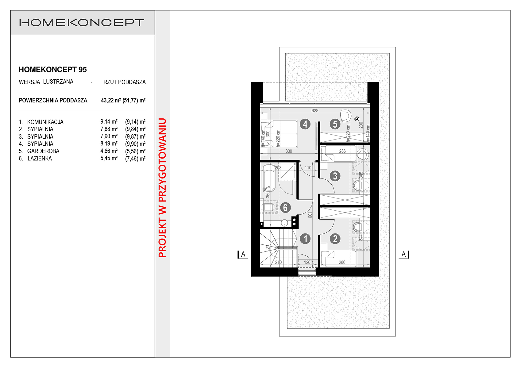 Na poddaszu tego domu jednorodzinnego udało się zaprojektować 3 sypialnie oraz łazienkę. Jedna z sypialni została zaprojektowana z garderobą Przy takiej aranżacji przestrzeni jaką mamy w projekcie domu HOMEKONCEPT 95 bardzo komfortowo może mieszkać 5-osobowa rodzinia.
