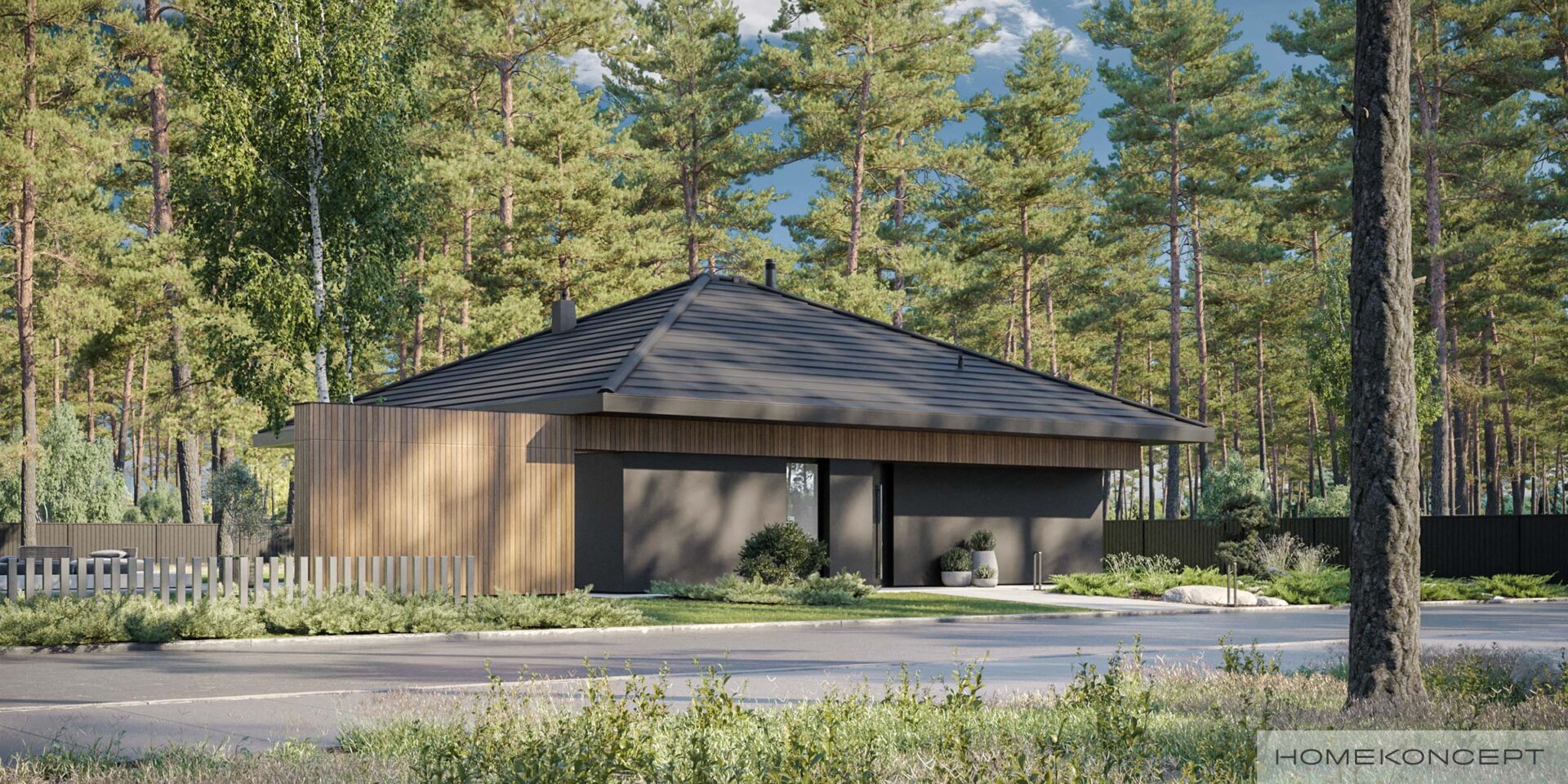 Nowoczesny projekt domu HOMEKONCEPT 97 to kwadratowa bryła pokryta czterospadowym dachem. Bryła tego domu to bardzo prosty kształt na planie kwadratu. Jednak niech wszystkich oglądających to nie zmyli… Prosta, kwadratowa bryła została tutaj podkreślona nowoczesną elewacją zaprojektowaną z tynku silikonowego i desek elewacyjnych. Pazura dodaje ciemna cementowa bądź ceramiczna dachówka i ciemna, antracytowa stolarka okienno-drzwiowa.