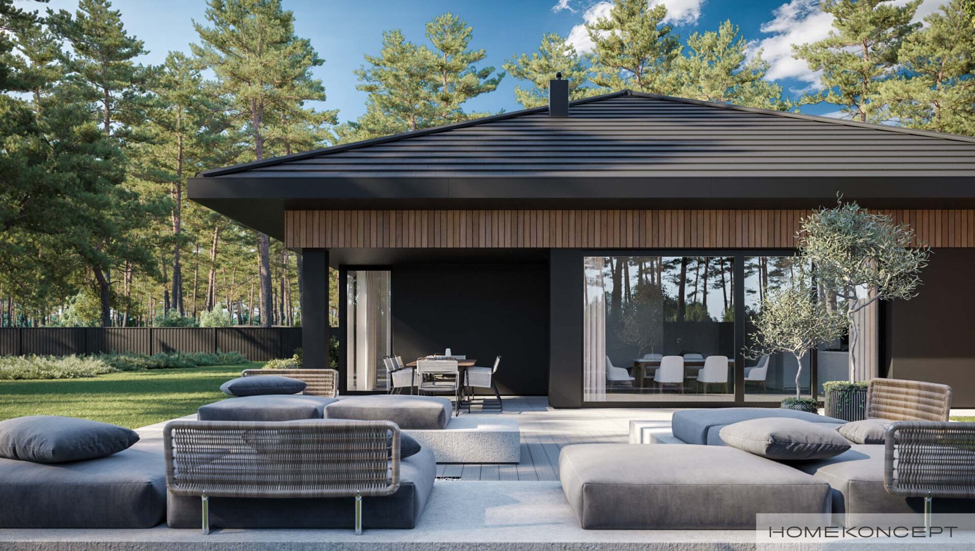Jakiego domu szukasz? Willi, domu w stylu stodoły, nowoczesnego, domu z poddaszem… a może domu parterowego? HOMEKONCEPT 97 Lustro łączy kilka z tych cech. Jest to projekt domu nowoczesnego i domu parterowego z dachem wielospadowym. Coś co go wyróżnia to przestronny taras okalający dom z czterech stron. Taki duży taras będzie idealnym miejscem szalonych spotkań z rodziną i przyjaciółmi w czasie ciepłych letnich miesięcy.
