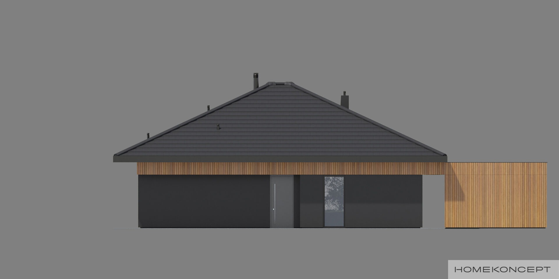 Nowoczesny projekt domu HOMEKONCEPT 97 to kwadratowa bryła pokryta czterospadowym dachem. Bryła tego domu to bardzo prosty kształt na planie kwadratu. Jednak niech wszystkich oglądających to nie zmyli… Prosta, kwadratowa bryła została tutaj podkreślona nowoczesną elewacją zaprojektowaną z tynku silikonowego i desek elewacyjnych. Pazura dodaje ciemna cementowa bądź ceramiczna dachówka i ciemna, antracytowa stolarka okienno-drzwiowa.